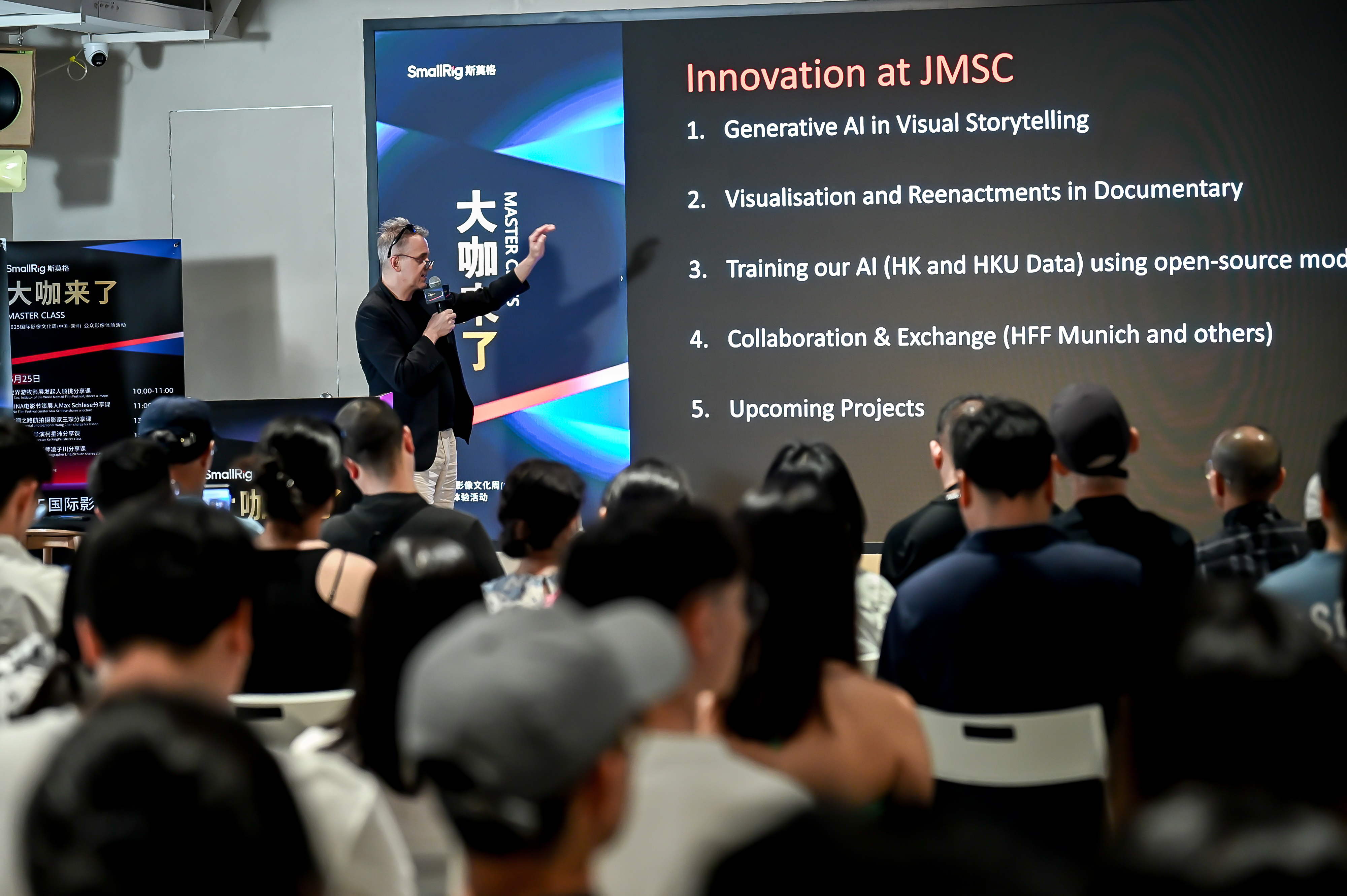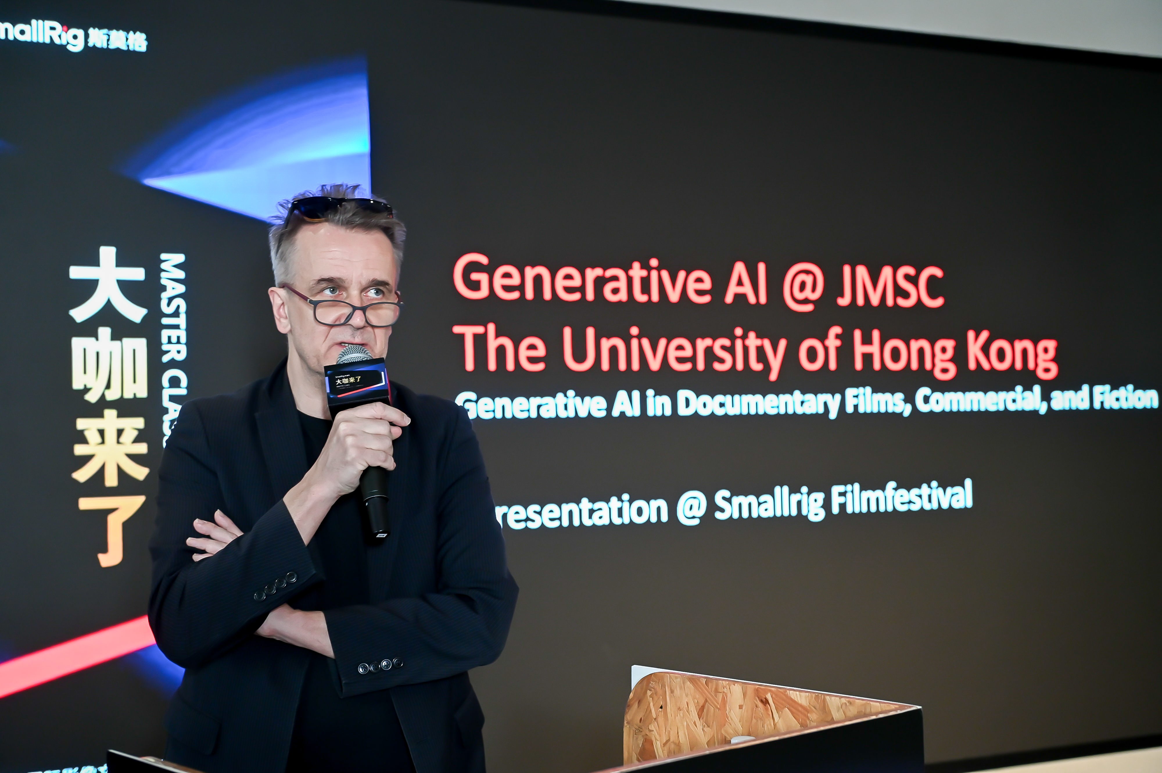 Uli introduced a generative AI education initiative launched by HKU's GMSC, saying, "The new agenda at GMSC focuses on generative AI and visual storytelling. AI is a powerful tool for visual narratives. People can now use it to create videos, voices, and even music. That's exactly what we're integrating into our documentary work."