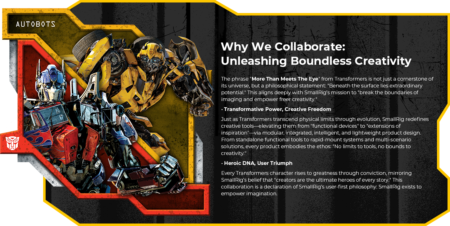 SmallRig’s collaboration event with Transformers will open on the official website from August 13 to 28, 2025. Pre-booking entitles users to a free (valid only for collaborative products from August 28th to September 28th) and automatic entry into a lucky draw for a TF Tool Kit Gift Box (redeemable only with the purchase of a collaborative product by September 28th).