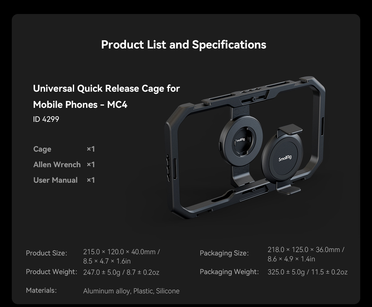 We are proud to present the latest addition to our mobile phone accessories lineup: the SmallRig Universal Quick Release Mobile Phone Cage MC4 4299. Designed to provide a professional and convenient solution for mobile video shooting and live broadcasting, this versatile cage offers a range of features that will elevate your mobile filmmaking experience to a whole new level. Key features are as follows.