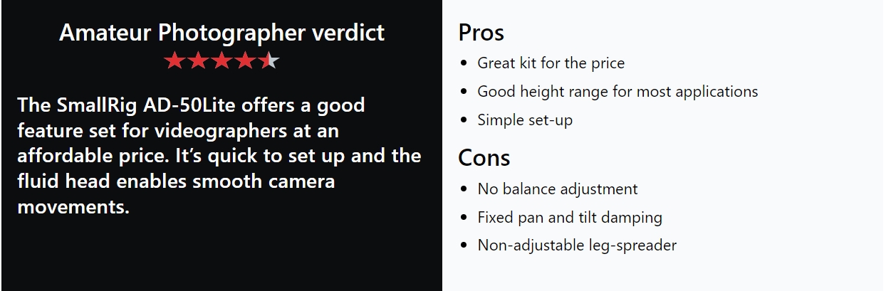 We would like to thank Original Author - Angela Nicholson for their original work that inspired this article. For the full version of the original content, please visit 【SmallRig AD-50Lite review – the ideal affordable video tripod?】at Amateur Photographer. We have made every effort to properly attribute and respect the intellectual property of the original author. If you have any questions or concerns regarding the content of this article, please feel free to contact us.